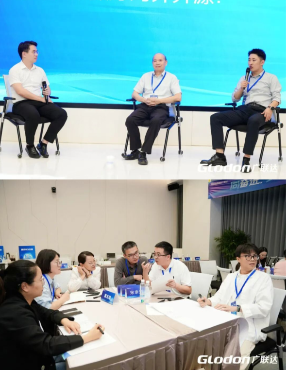 在会议的研讨环节,杨总与深圳市普利工程咨询有限公司董事长吴日升在台上围绕新质生产力、数字化等为企业带来的机遇、挑战展开交流并主持研讨。